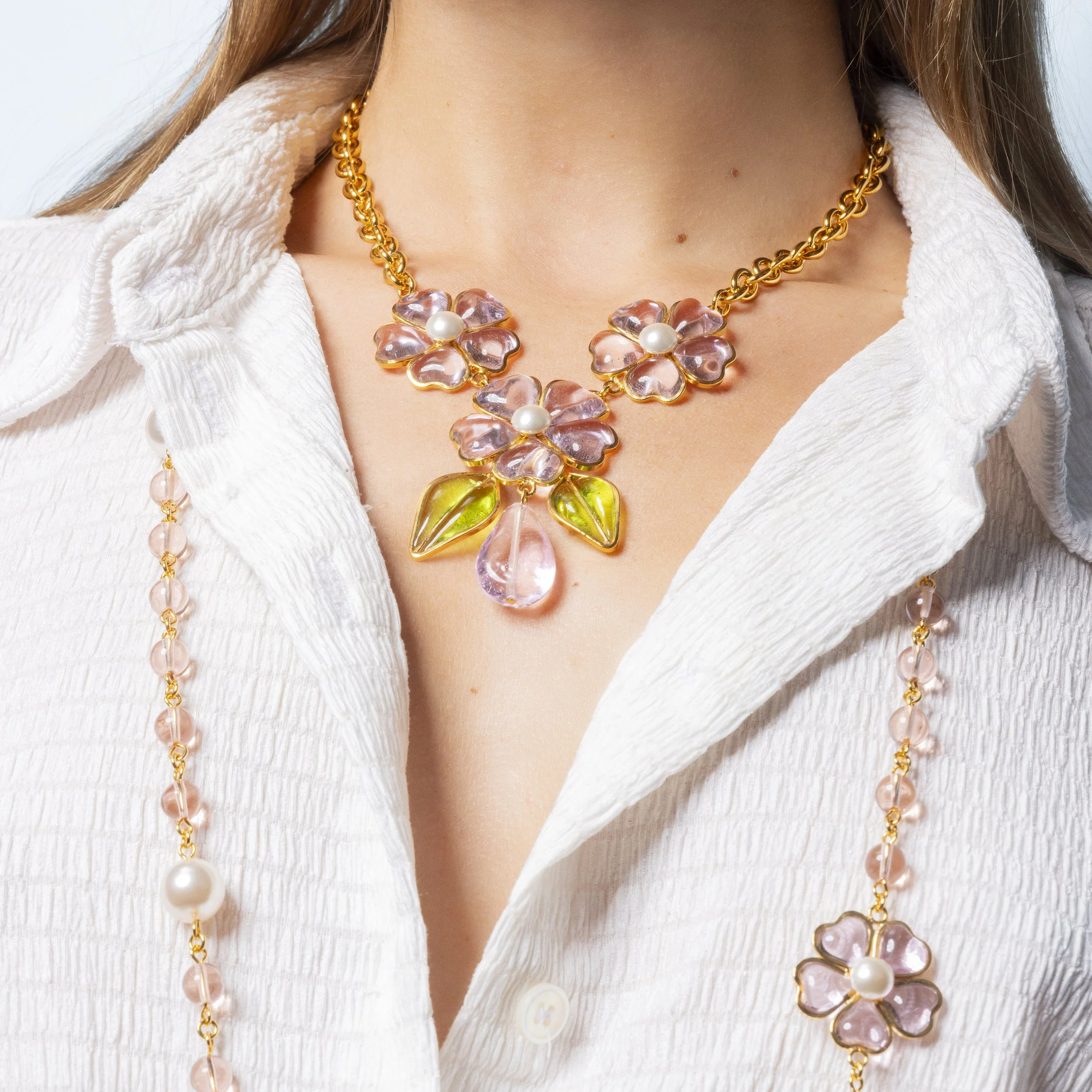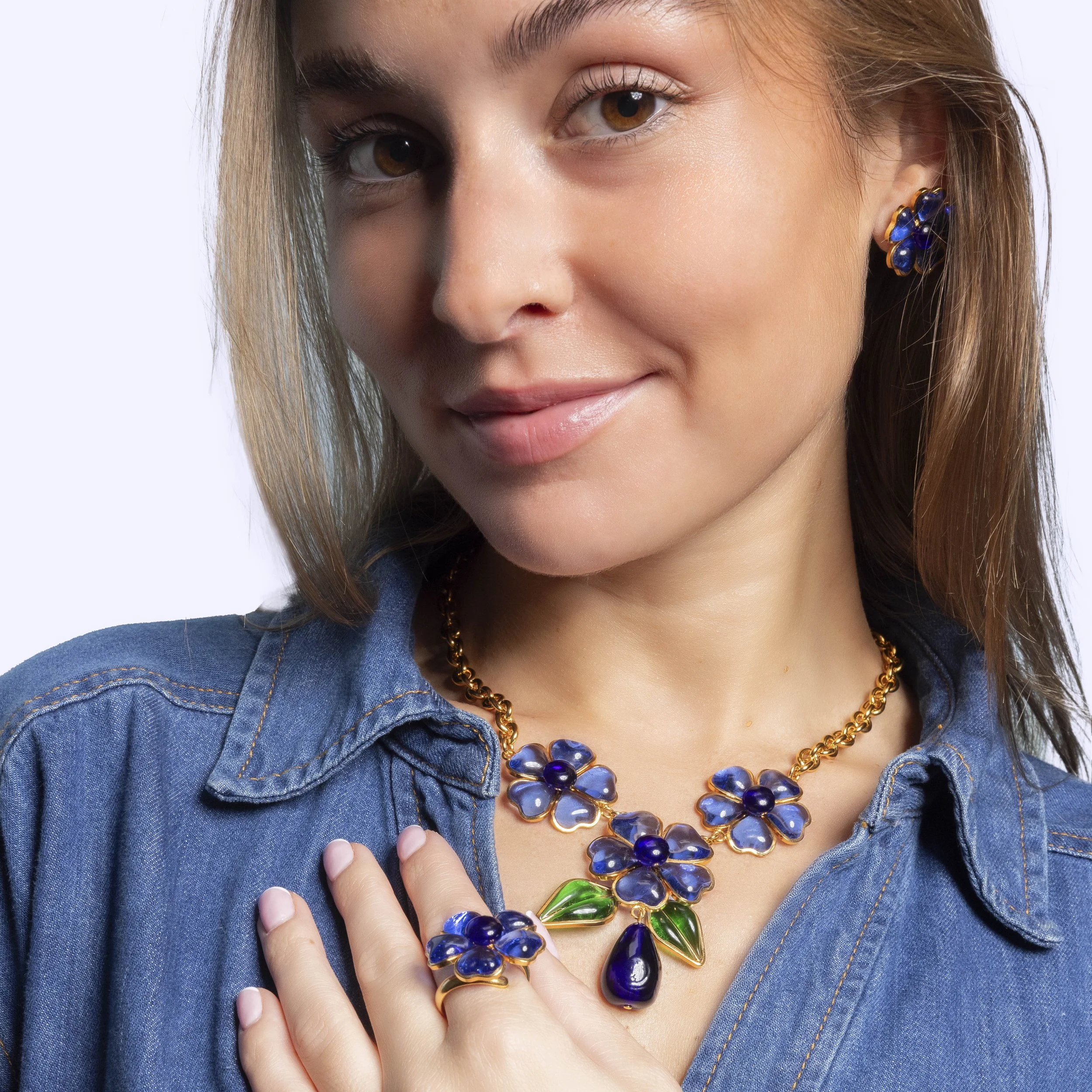 Chaque bijou de la Maison Augustine est unique, issu du savoir-faire familial exceptionnel du coulage de verre. Cette technique artisanale fait naître des pièces aux nuances légères telles que des variations de couleur et des petites bulles d’air, donnant à chaque création le charme si précieux du fait main.