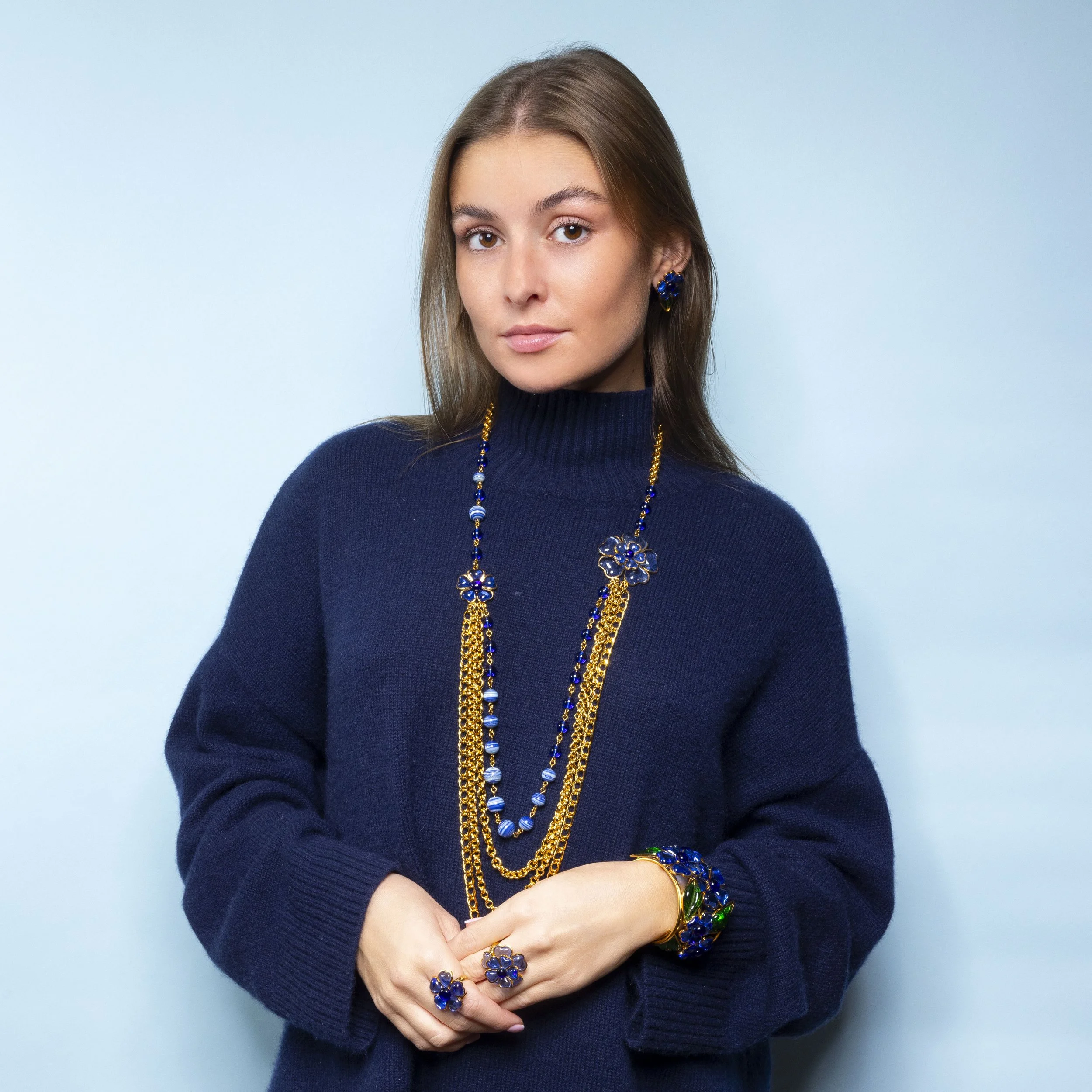 Chaque bijou de la Maison Augustine est unique, issu du savoir-faire familial exceptionnel du coulage de verre. Cette technique artisanale fait naître des pièces aux nuances légères telles que des variations de couleur et des petites bulles d’air, donnant à chaque création le charme si précieux du fait main.